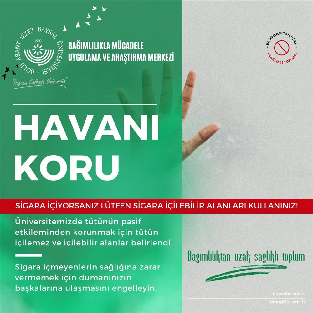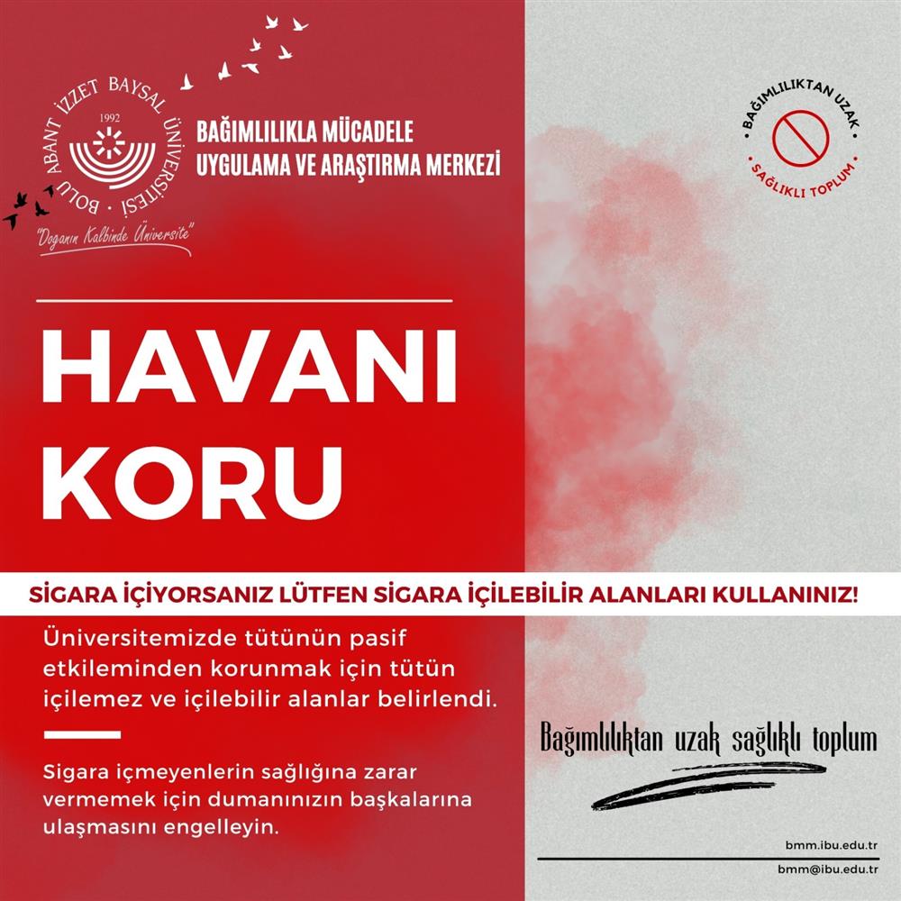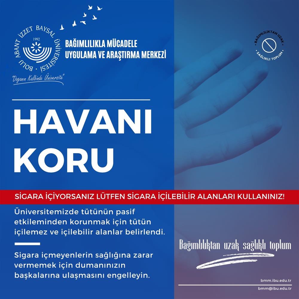 Bolu Abant İzzet Baysal Üniversitesi (BAİBÜ), sağlıklı bir çevre ve toplum oluşturma hedefiyle "Dumansız Kampüs" olma yolunda önemli bir adım attı. Bu kapsamdaki bilgilendirme ve bilinçlendirme çalışmaları, üniversitenin Bağımlılıkla Mücadele Uygulama ve Araştırma Merkezi tarafından yürütülüyor.