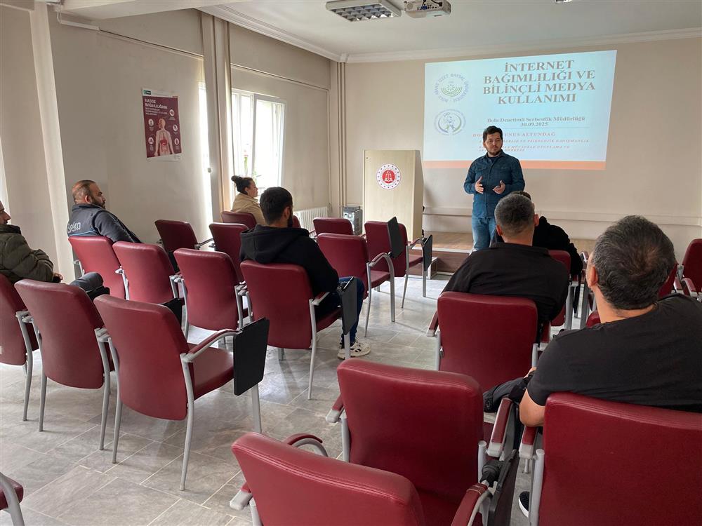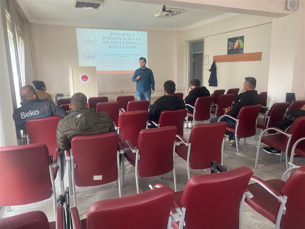 Bağımlılıkla mücadele uygulama ve Araştırma merkezi yönetim kurulu üyemiz sayın Doç. Dr. Yunus ALTUNDAĞ hocamız Üniversitemiz ile yapılan protokol kapsamında Bolu Denetimli Serbestlik Müdürlüğü bünyesinde "İnternet Bağımlılığı ve Bilinçli Medya Kullanımı" başlıklı bir seminer gerçekleştirmiştir. Seminer kapsamında teknolojinin günümüzde meydana getirdiği riskler ve bu risklerle başa çıkmaya ilişkin konular ele alınmıştır