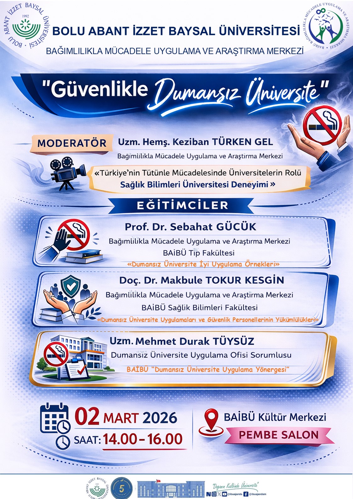 Mehmet Durak Tüysüz ise “BAİBÜ Dumansız Üniversite Uygulama Yönergesi” çerçevesinde uygulama süreçlerine yönelik değerlendirmeleriyle katkı sağlayacaktır.