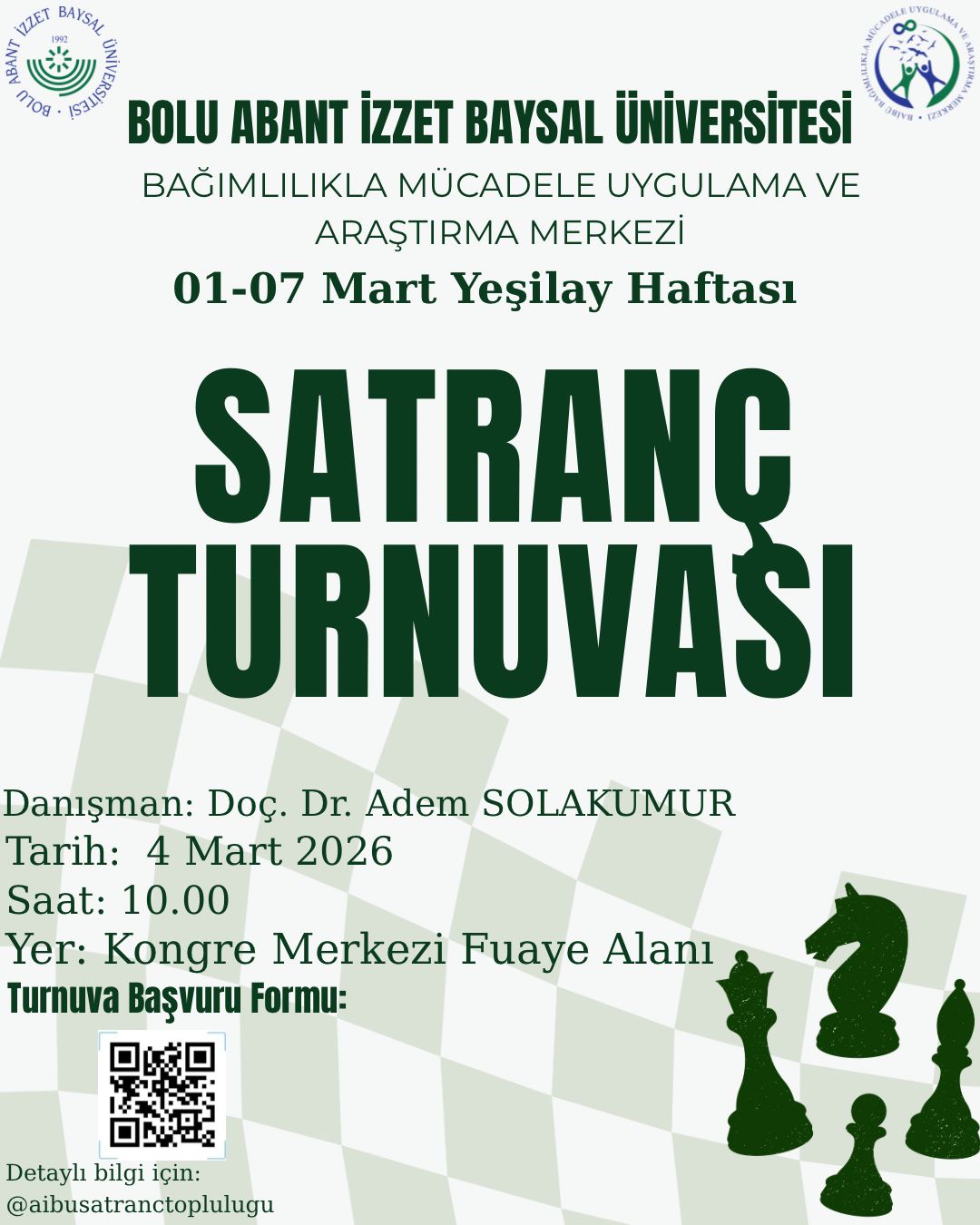 Turnuvaya katılmak isteyen öğrencilerimiz, etkinlik afişinde yer alan karekodu kullanarak başvuru formuna erişebilirler. Organizasyona ilişkin güncel bilgilendirme ve duyurulara ise @aibusatranctoplulugu Instagram hesabı üzerinden ulaşılabilmektedir.