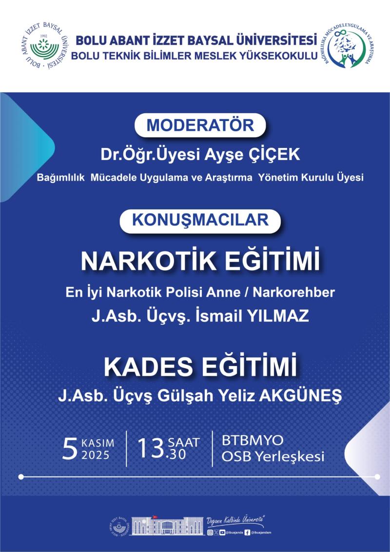 Bolu Abant İzzet Baysal Üniversitesi (BAİBÜ) Bolu Teknik Bilimler Meslek Yüksekokulu (BTBMYO) tarafından, Bağımlılıkla Mücadele Uygulama ve Araştırma Merkezi iş birliğiyle “Narkotik Eğitimi ve KADES Eğitimi” konulu bilinçlendirme etkinliği düzenlenecektir.